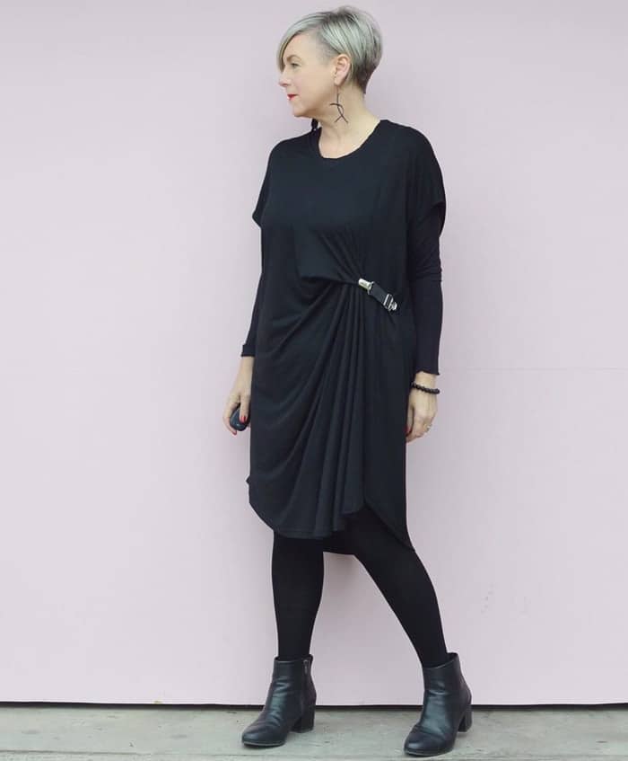 Deborah, ici en photo, combine une tunique drapée et des collants en cachemire, preuve que confort et style font bon ménage.