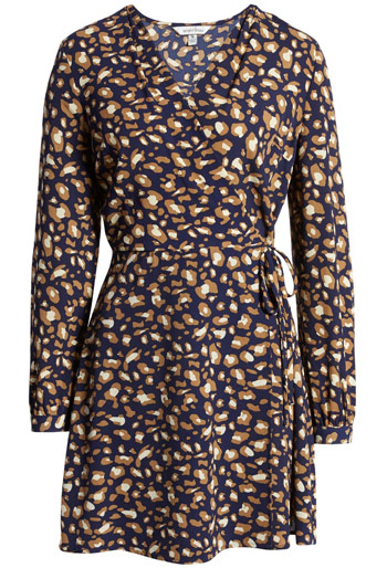 La robe portefeuille reste une valeur sûre. Celle-ci, courte mais dotée de manches longues, offre un compromis entre audace et couverture, sans tomber dans l’excès.